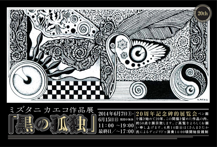 20周年記念碑的展覧会 ペン画を描き始めて20年。この間描き留めた作品の内、約50点を展示致します。ご高覧をよろしくお願い申し上げます。 6月14日(土)はくさんまさたか氏によるディジリドゥ演奏 14:00頃開始 投銭制